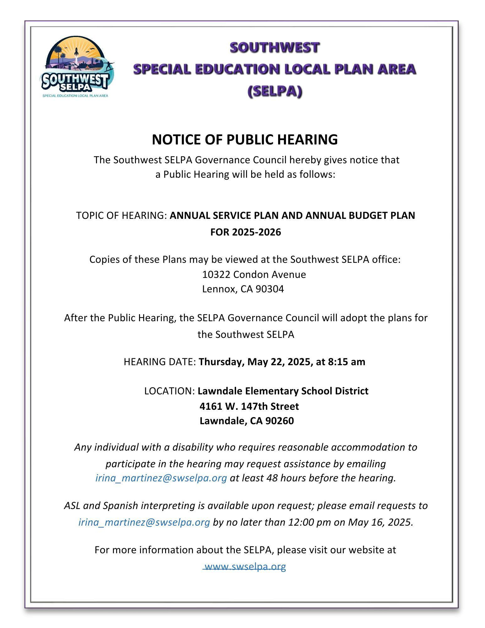 Annual Service Plan and Annual Budget Plan for 2025-2026 / Plan De Servicio Anual Y Plan de Presupuesto Anual para El Año Escolar 2025-2026